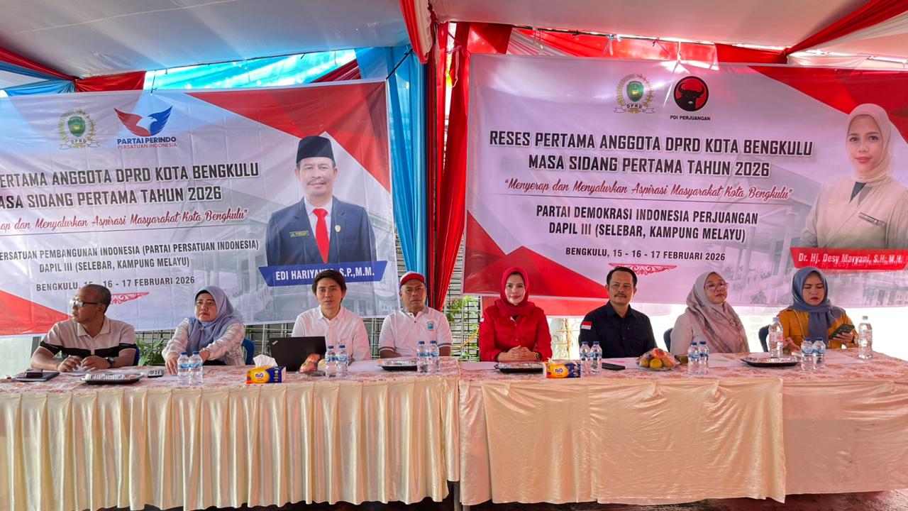 BENGKULU – Anggota DPRD Kota Bengkulu dari Partai Perindo, Edi Hariyanto, S.P., M.M., menggelar reses pertama masa sidang awal tahun 2026 di Jalan DP. Negara No. 40 RT 05, Kelurahan Betungan, Kecamatan Selebar, Kota Bengkulu. Kegiatan tersebut turut dihadiri Desi Maryani, S.H., M.H., serta sejumlah perwakilan Organisasi Perangkat Daerah (OPD) terkait.